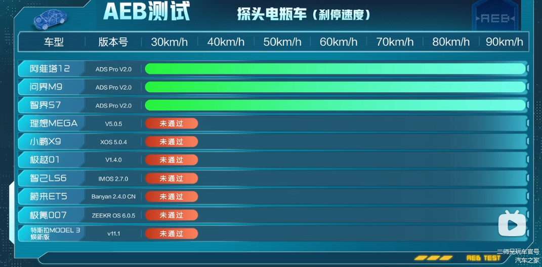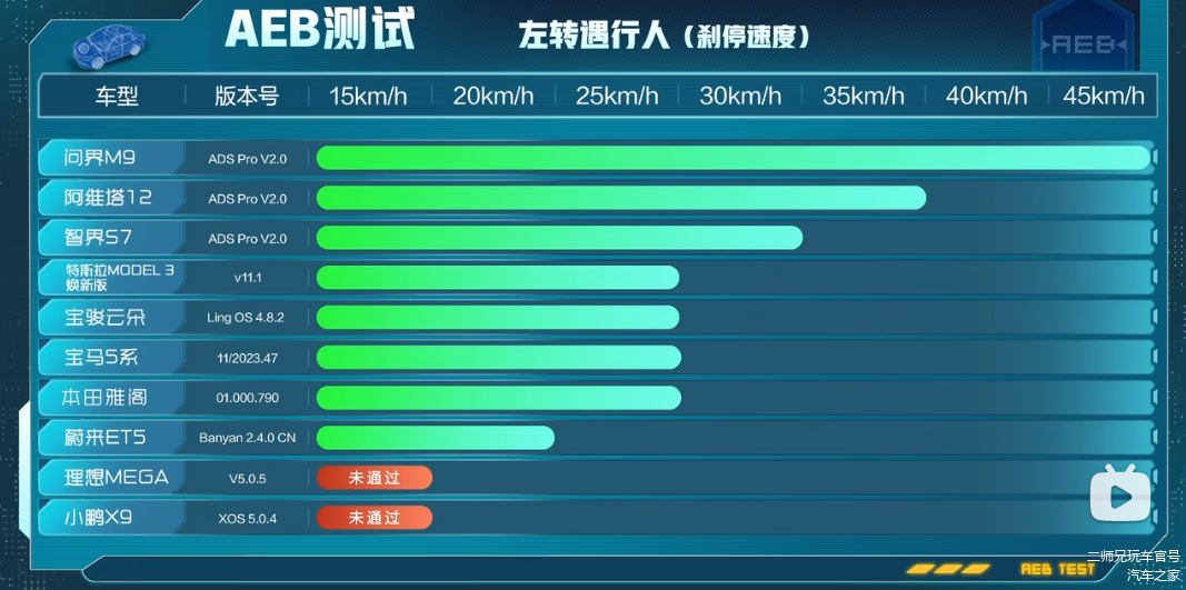 场景五:左转遇行人。结果显示,问界M9能以45km/h的速度刹停,阿维塔12和智界S7能以30km/h和35km/h的速度刹停,其余车型大多数都在30km/h以下,这个相对而言难度还是有点大的,所以,现场有6款车型未通过测试。