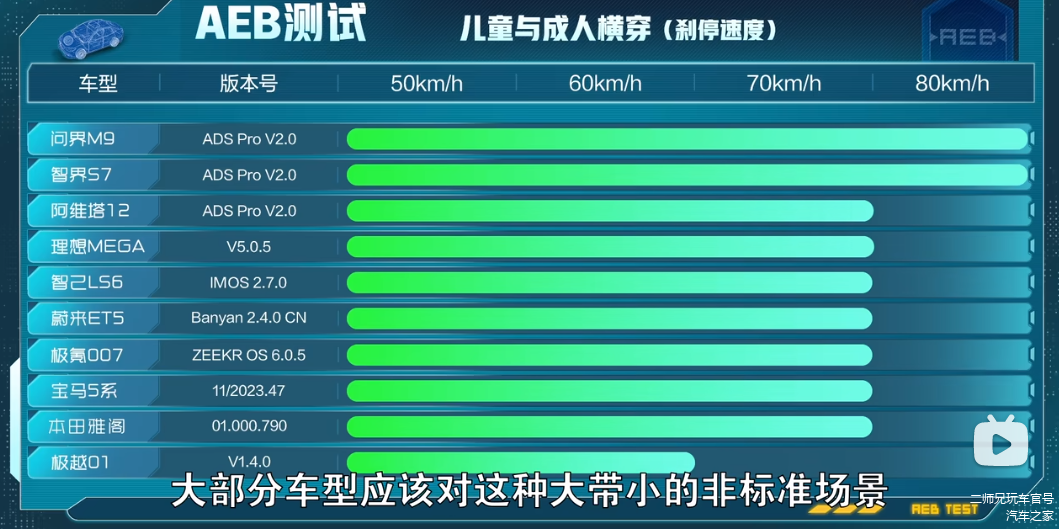 场景四:儿童与成人横穿。这个模拟的是成人带小孩儿出行过马路的场景,结果显示,问界M9和智界S7能以80km/h的速度刹停,遥遥领先于其它车型。