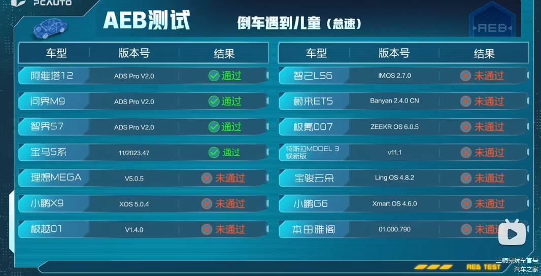 场景六:倒车遇到儿童。结果显示,仅有华为系三款车以及宝马5系通过测试,其余全部失败。