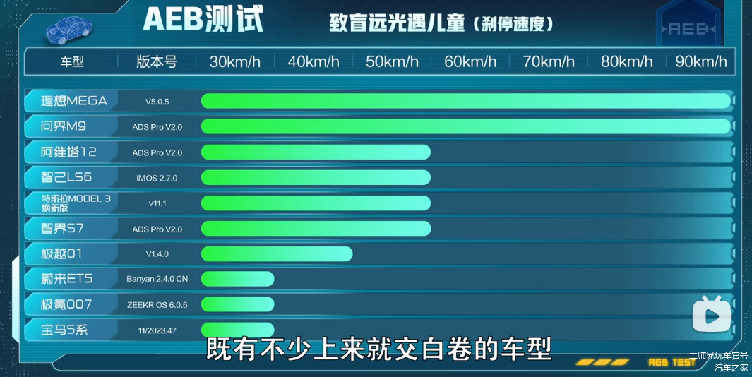 场景七:致盲远光遇儿童。结果显示:理想MEGA、问界M9是仅有的两款能以90km/h刹停的车型,其余车型均在60km/h以下;另外有4款车没有通过测试。