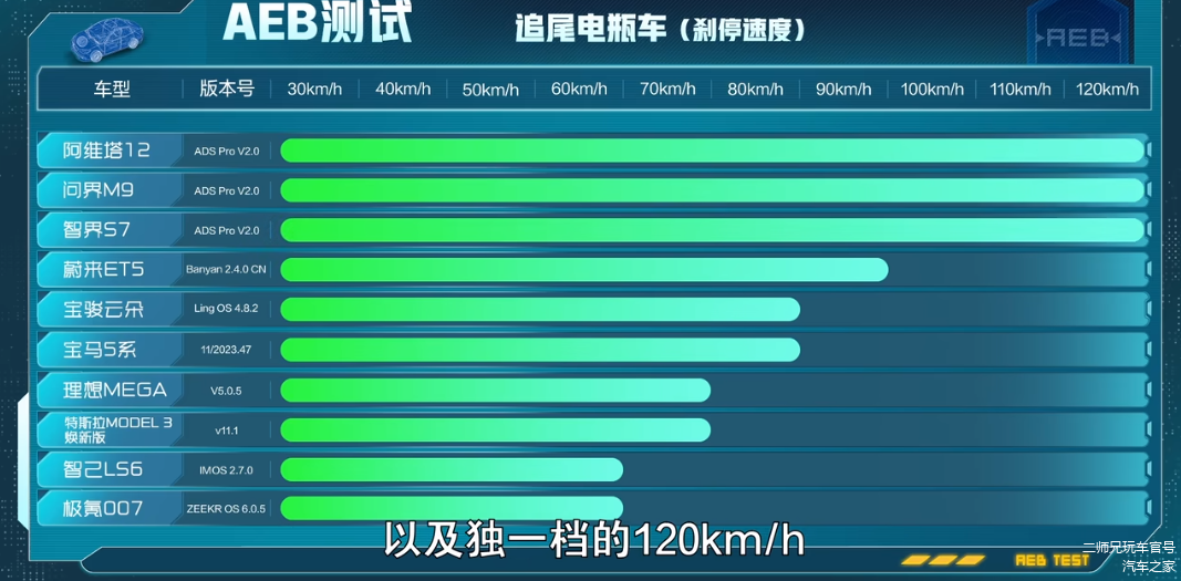 场景一:追尾静置的电瓶车。结果显示,华为系三台车阿维塔12、问界M9、智界S7可实现120km/h刹停,断崖式领先,其余车型大多数在60-90km/h之间。