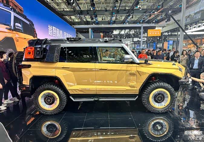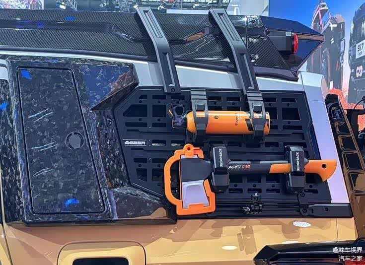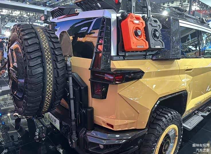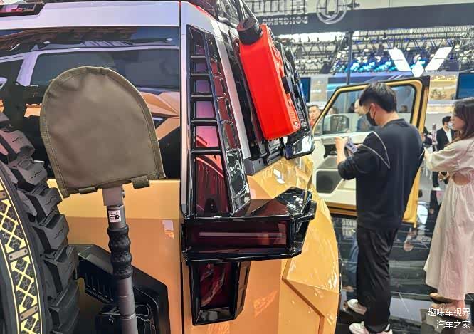新车在外观配色上,官方称之为沙漠风暴黄军事涂装”风格,上半部分以银色涂装,车顶处还加入了黑色的行李架等等,借鉴了军车的设计元素。此外,新车下方还提供有全封闭式旋翼锻造轮辋和前后宽体轮眉,还有脚踏板的加持,越野性能更胜一筹;C柱位置设置有挂架,现场展车的挂架上放置了灭火器、消防斧、油桶/水桶等。车尾部分,尾部的备胎附近还设置有工兵铲,越野工具十分的齐全,此外在车顶扩展平台上集成了前射灯、示廓灯、营地灯等,最大程度上满足消费者的个性化需求。对于这样的外观,你觉得如何呢?