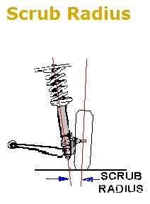 在介绍扭力转向之前,先要明白什么叫做磨胎半径(scrub radius)。所谓磨胎半径,就是车轮转向主销(主销指的是转向轮转向时所围绕的轴线)的延长线与地面的交点,到车轮接地中心点之间的距离。如下图
