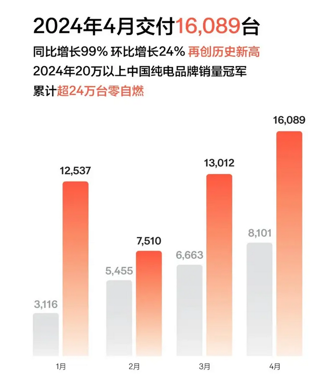 极氪汽车于5月1日公布了2024年4月的销量数据。根据官方数据显示,极氪在4月份的交付量达到了16089台,同比增长99%,环比增长24%,创下历史新高。