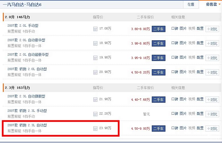 如果你只是想买个马六作为家用代步,我严重不推荐2.3L版本,现如今08年的2.0L马六正常行情价低到白菜价,手动大致在5.5~5.8万,自动在6~6.3万之间。碰上车况次点的,价格更低。这样一对比,2.0L马六性价比简直甩2.3L马六几十条街。