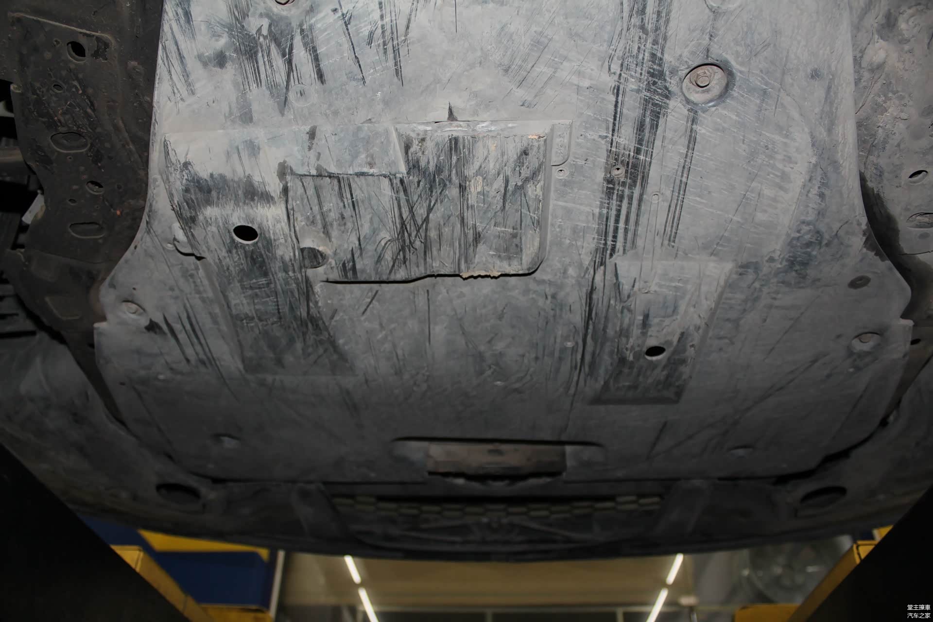 降低车身,底盘果然未能幸免。不过刮痕虽有,有发动机护板挡着,影响却微乎其微。一来是北京烂路少,毕竟是首都,关系到整个中华民族的脸面,路政部门不敢怠慢。二来车主开车比较小心。