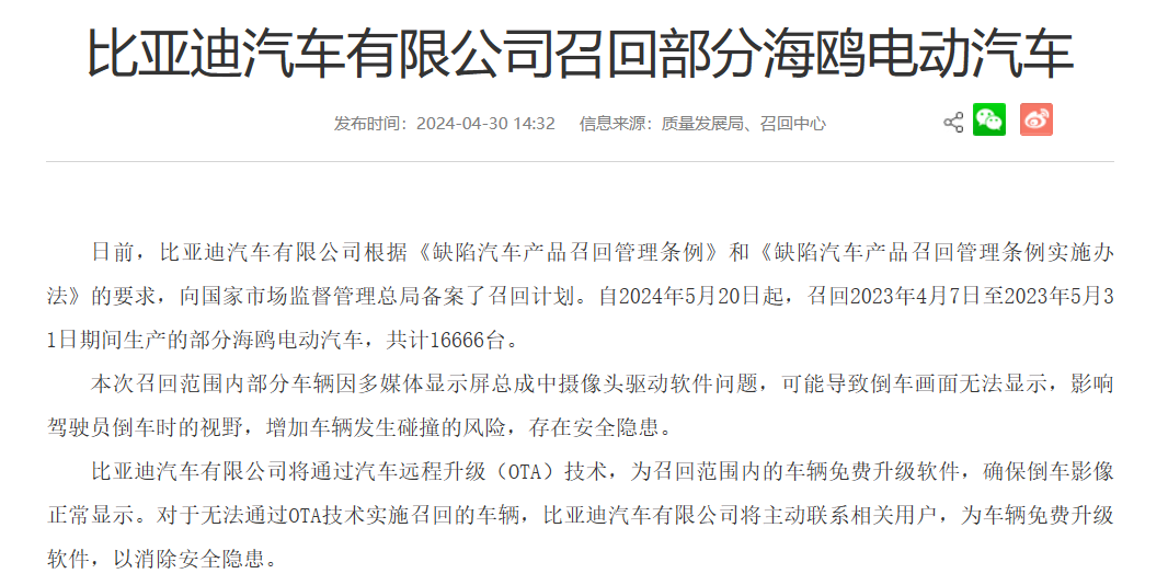 4月30日,五一小长假的前夕,比亚迪汽车召回16666台海鸥,这是比亚迪汽车2024年首次召回车辆,并且是主动召回,这里要给比亚迪汽车点个赞。