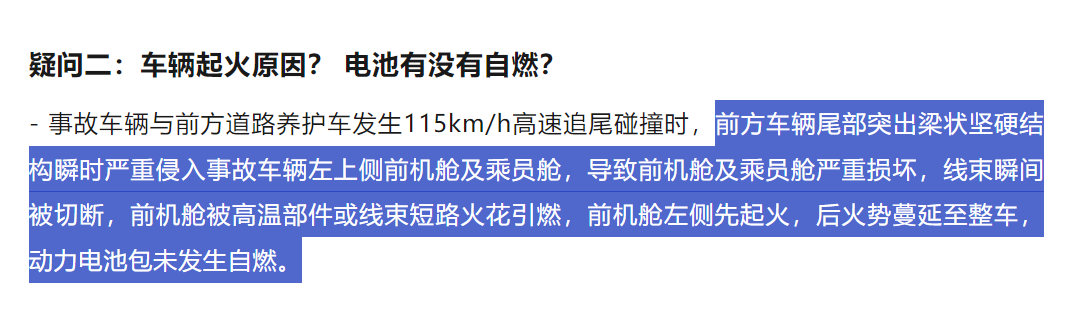 根据赛力斯汽车官方的说明来看,是因为车辆高速追尾前方作业车辆时,前方车辆尾部突出的梁状结构,瞬间侵入车辆坐上侧前机舱及乘员舱,导致前机舱及乘员舱严重损坏;线束瞬间被切断,前机舱被高温部件或线束短路火花引燃;前机舱左侧先起火,然后火势蔓延至整车。简单来说,车辆在以115公里时速,猛烈撞向作业车时,其电池并没有因冲击、变形,或者被其他物体刺穿短路并起火;而是线束短路引发的起火。