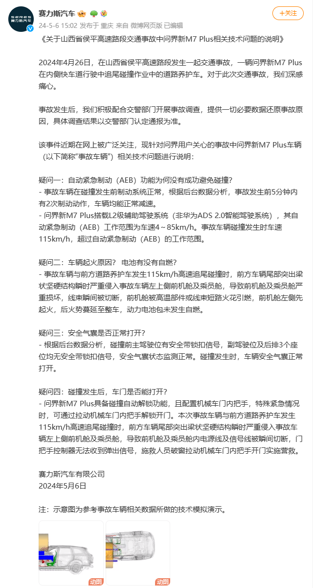 日前,一辆 问界M7(图片 | 参数 | 询价)在山西运城段的高速上追尾一辆作业车。此事一出,立刻引发了网友的激烈讨论,有部分不了解事情全貌的网友,武断地认为,是车辆追尾后,没有触发碰撞自动解锁功能,同时车辆电池起火,导致遇难者被困而引发的悲剧。但根据此前网上的信息、遇难者家属的声明,以及赛力斯汽车官方在5月6日下午最新发布的说明来看,事实并非如此!