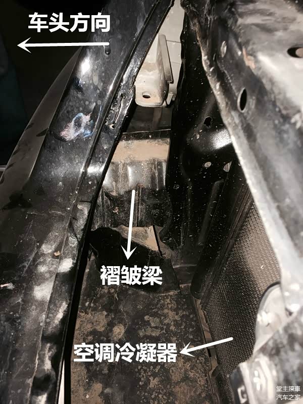 褶皱梁有些许变形,但变形痕迹不明显。防撞钢梁竟然丝毫无损。我猜测这次事故是追尾了一次高底盘SUV,因为防撞钢梁位置较低,因此碰撞时避开了它,直接撞上了水箱框架的位置。导致水箱框架大变形。并且机舱盖损毁殆尽。