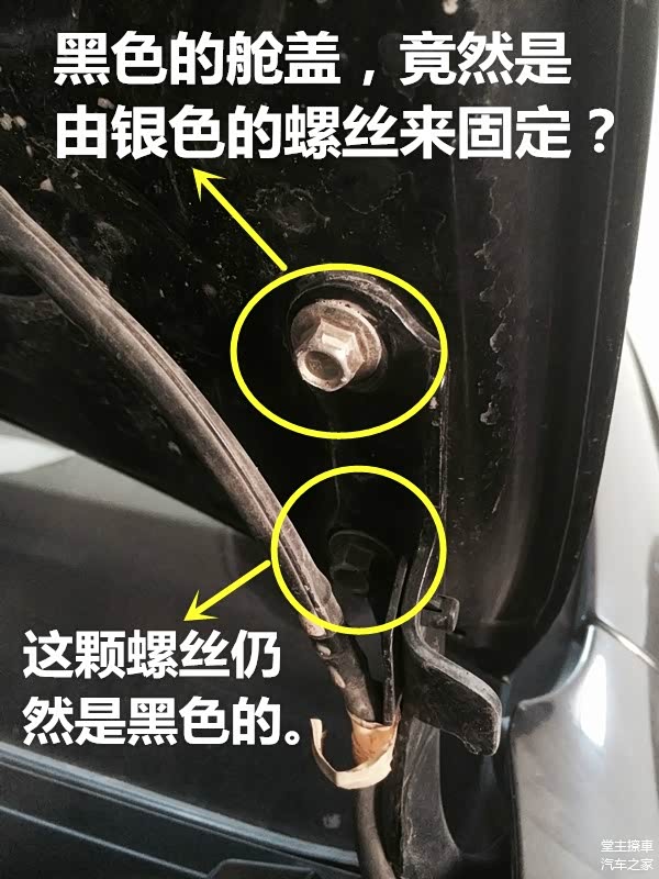 PS:机舱盖的螺丝一定会跟机舱盖同色,因为车辆还处在骨架阶段的时候,就会把机舱盖用螺丝固定上,然后再喷漆。所以凡是螺丝掉漆的,一定是后期拧过,更何况这螺丝颜色都不一样,一定是后期换过的。
