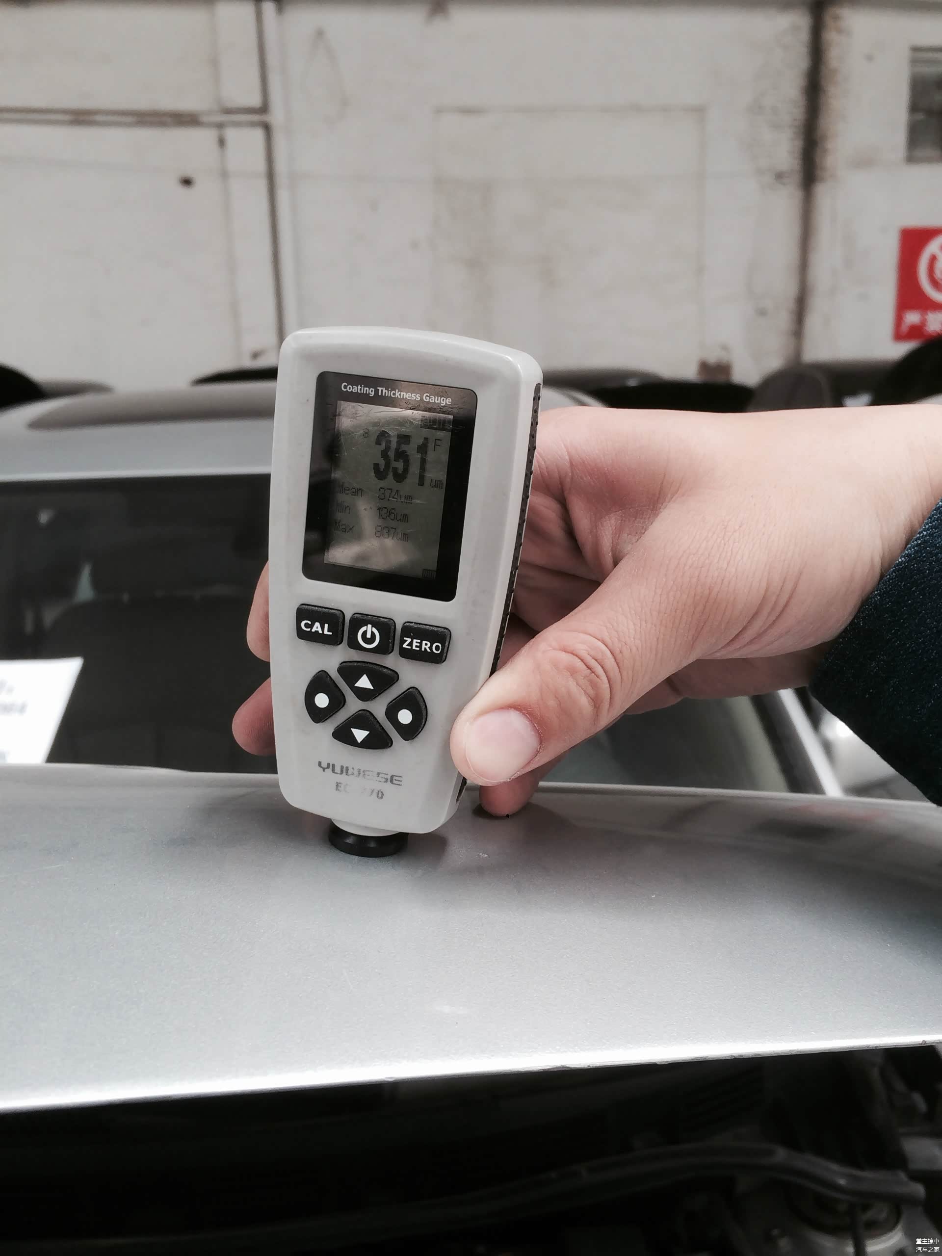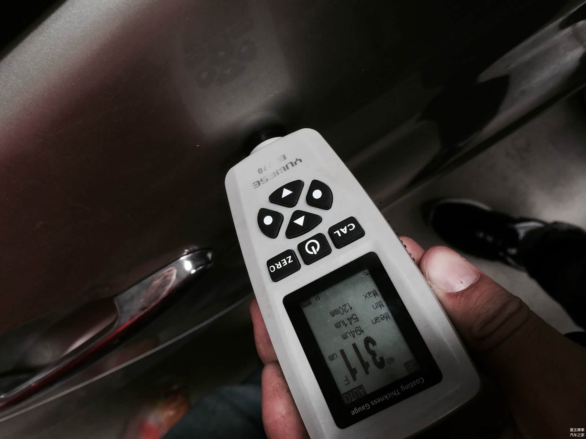 看上图,图中这个仪器就不用我多介绍了,它就是传说中的漆膜仪,测厚必备良品。图中数字是311um,这个数字远远超过了正常范围。说明这个覆盖件曾经打过腻子。