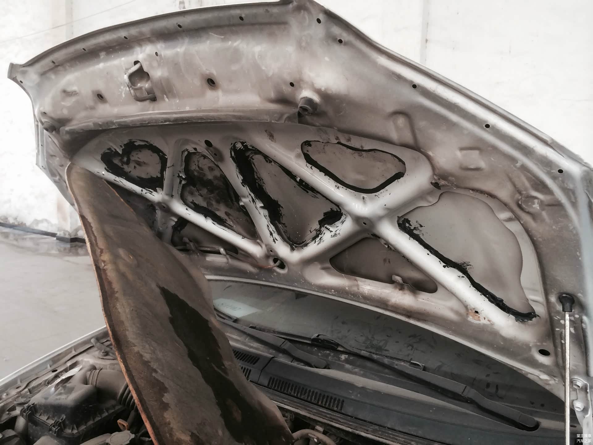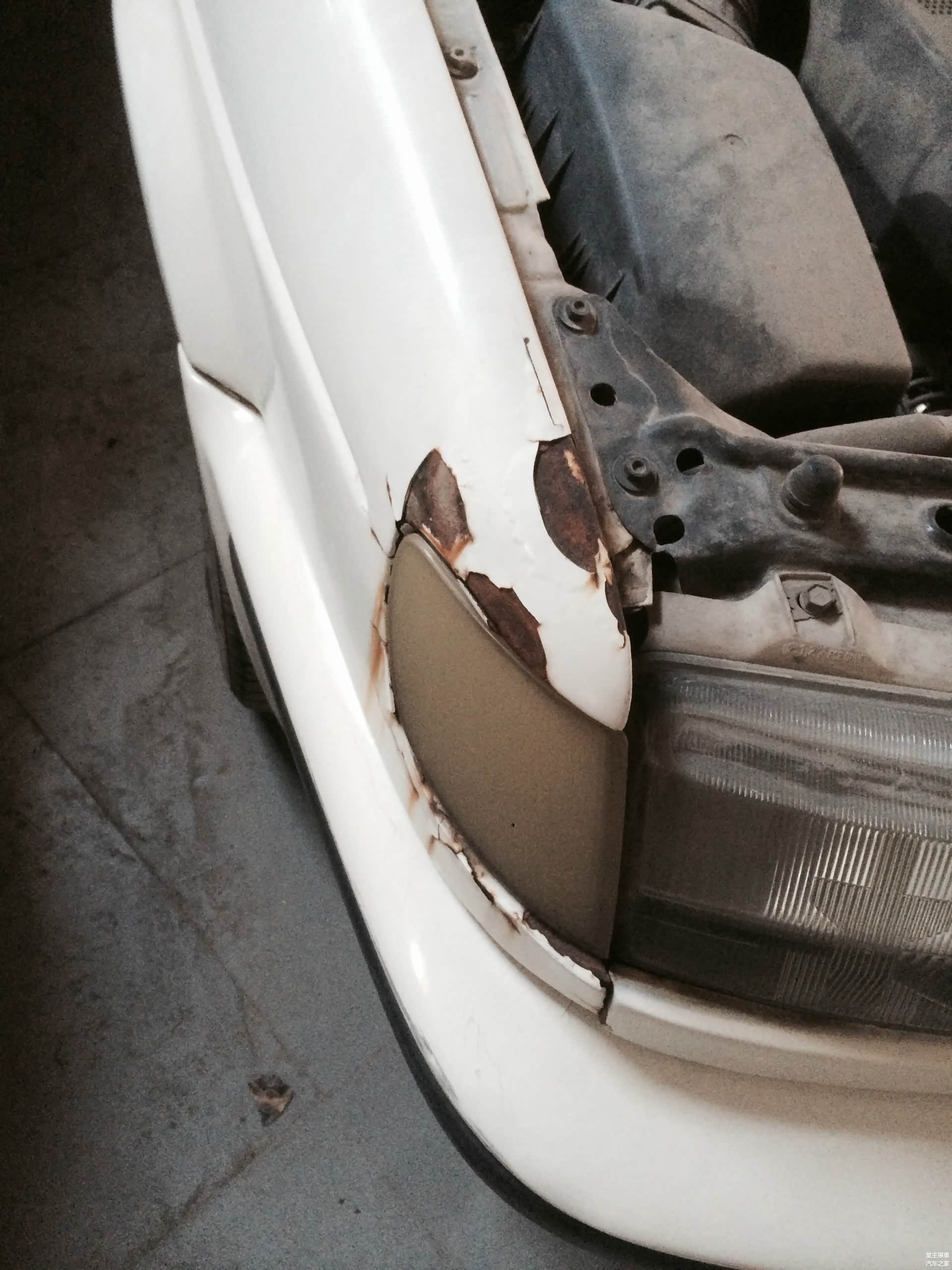 悬架塔顶油漆剥落、钢铁锈蚀,翼子板各种粗劣做漆痕迹,翼子板内部大梁也有敲打痕迹。