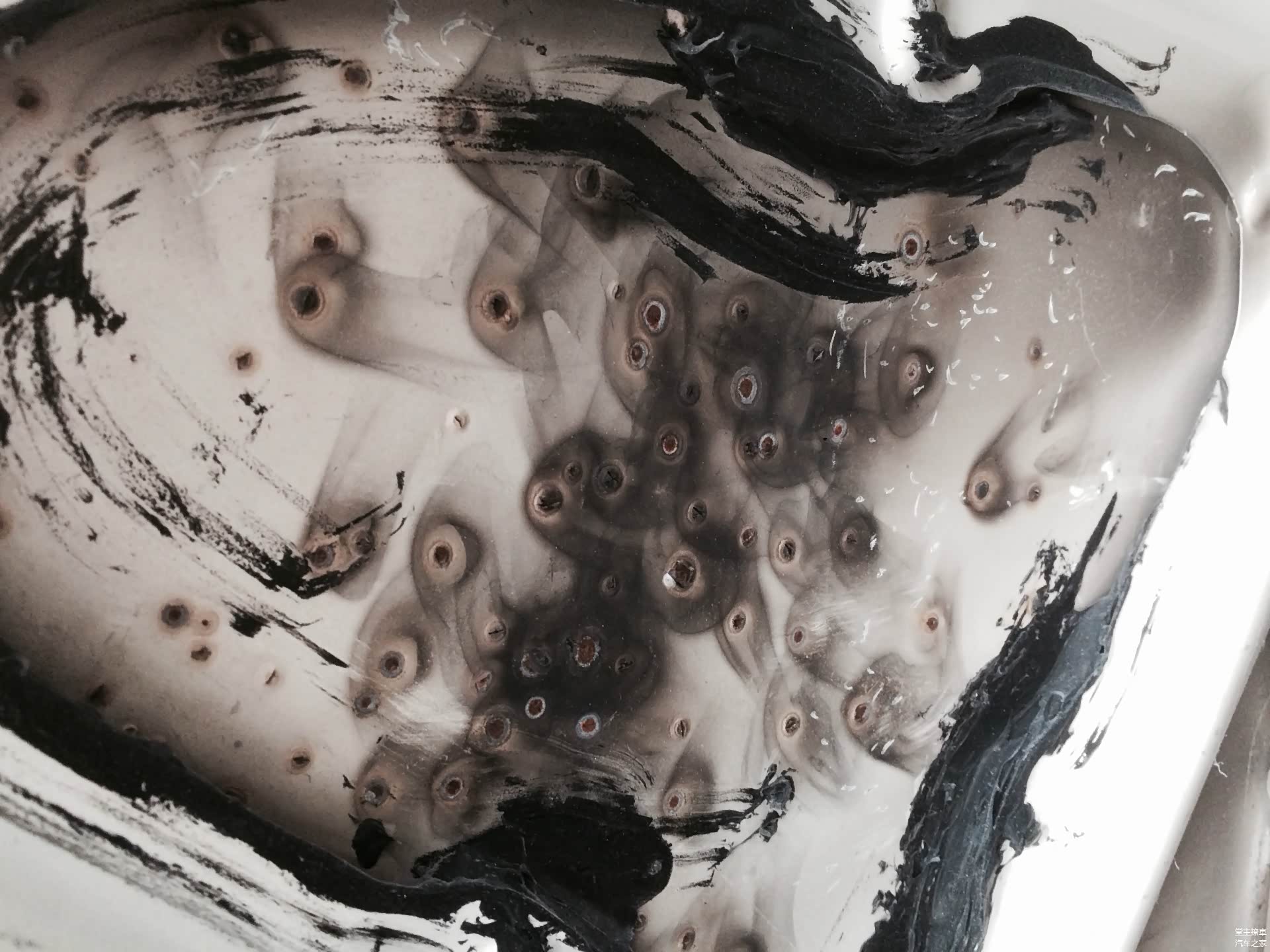 打开机舱之后,惨不忍睹的画面映入眼帘。整个水箱框架完全变形,各种钣金敲打拉伸的痕迹,画面凄惨。