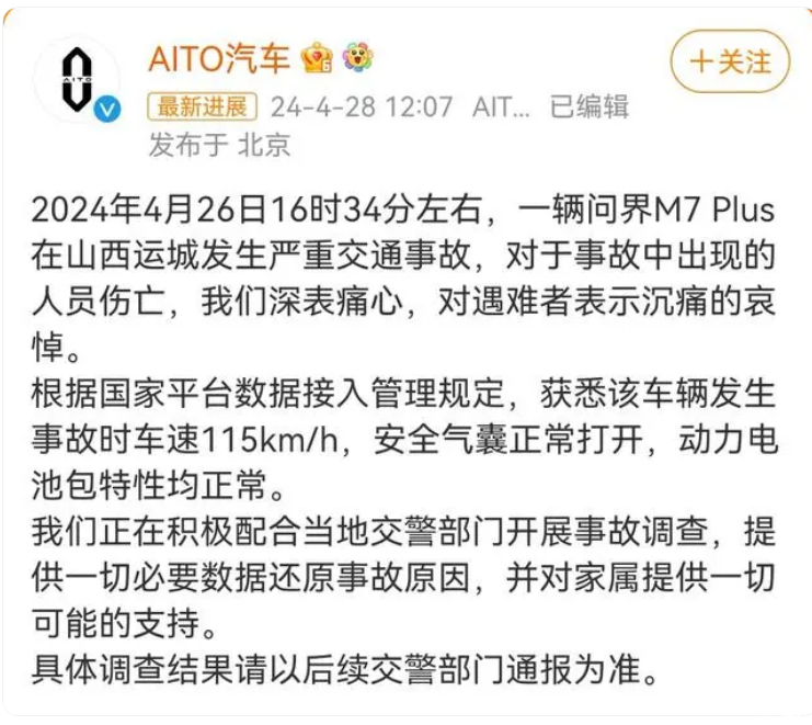 对于这起事故,问界官方表示将积极配合交警部门开展进一步的事故调查工作,提供一切必要的数据以还原事故原因。同时,他们也表示将对家属提供一切可能的支持。我们相信,在问界和交警部门的共同努力下,事故真相一定会水落石出。