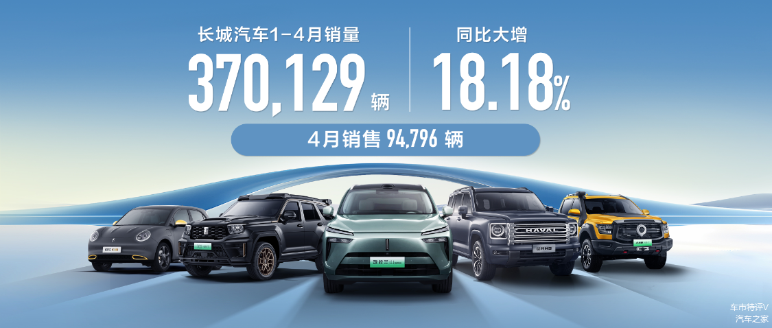根据长城汽车5月6日晚间发布的最新销量数据显示:4月份,长城汽车销量达到了94,796辆。海外市场表现良好,单月销量36,141辆,同比增长65.68%,创历史新高。新能源市场方面,单月销量达到了22,436辆,同比增长50.94%。1-4月份,长城汽车累计销量370,129辆,同比增长18.18%。