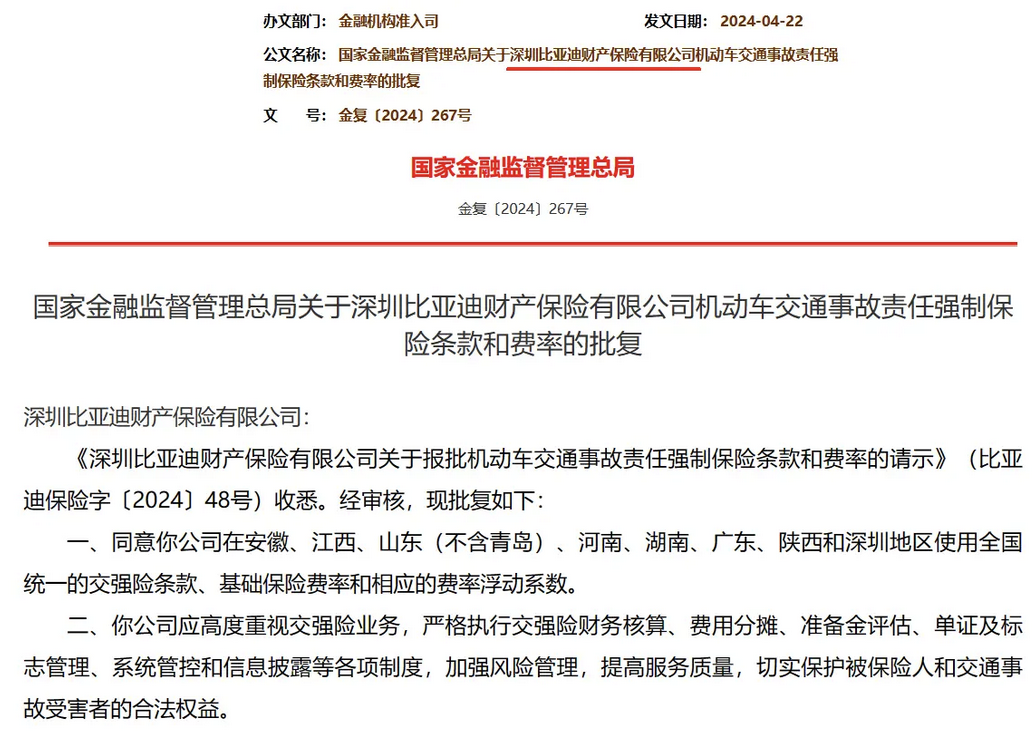 作为中国新能源车龙头,比亚迪车险业务已正式获批,2024年5月6日,国家金融监督管理总局对比亚迪财险关于报批机动车交通事故责任强制保险条款和费率的请示作出公开回复,同意其在安徽、江西、山东(不含青岛)、河南、湖南、广东、陕西和深圳地区使用全国统一的交强险条款、基础保险费率和相应的费率浮动系数。