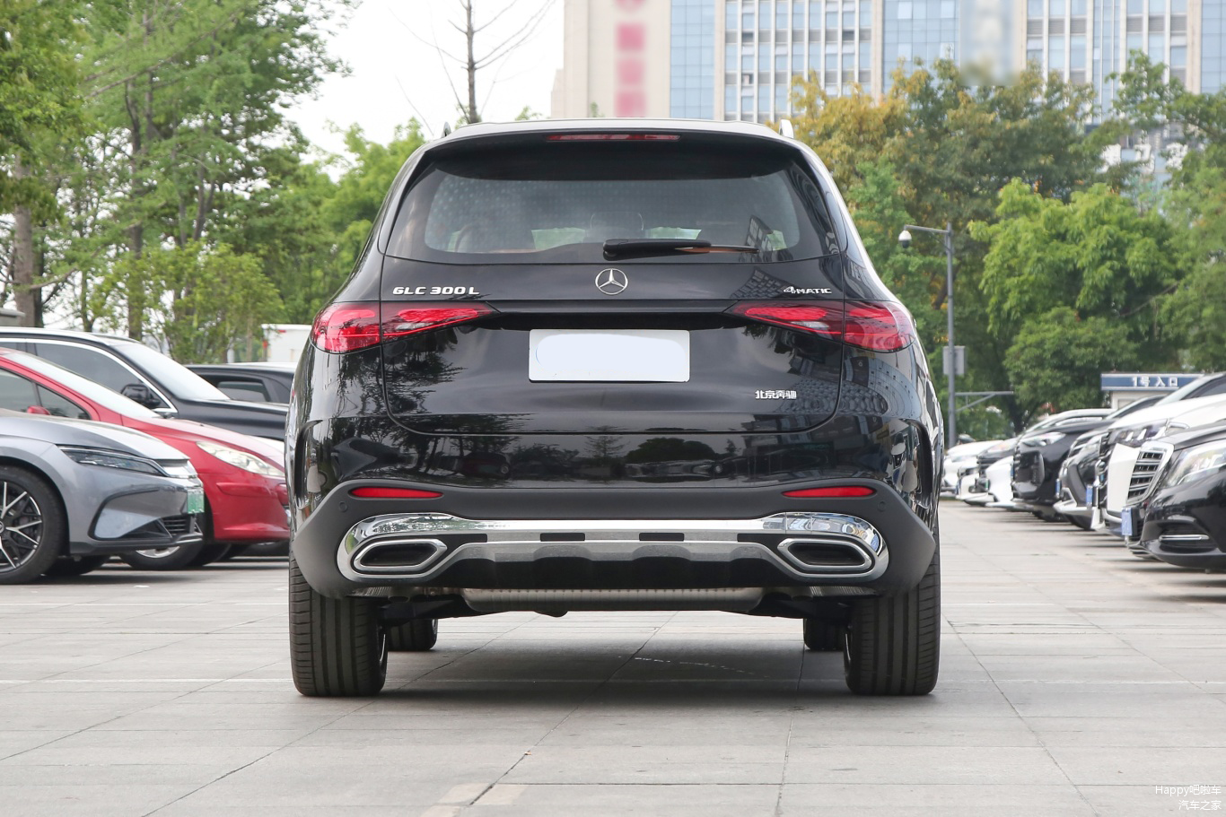 奔驰GLC的尾部呈现上窄下宽的造型趋势,上方尾窗两侧边轮廓向外倾斜延伸,与尾灯组凸出处形成波折形态,使下至位的形状更为饱满厚重,两侧尾灯组以平面形式直观上去呈现下端倾斜的水滴造型,内部以同样的造型趋势进行拼接,其富有一定的视觉元素,底部由黑色挡板与银色镀铬进行拼接填充。