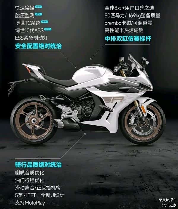 2024款春风450SR-S在配置上有自动大灯、全车LED灯源、ESS紧急制动系统,还优化刹车手感,前Φ320mm和后Φ240mm的制动盘,以及Brembo品牌的前卡钳,这样的组合进一步增强了驾驶者对制动系统的信心。新车还相比老款进行了多项升级。首先,新车采用了博世10代双通道ABS防抱死系统,不仅优化了刹车手感,还提升了整车的制动效能。其次,博世TCS牵引力控制系统的加入,有效防止后轮打滑,保障车身稳定。此外,新增的内置胎压监测进一步提升了驾驶稳定性,以及配备了快排系统(单向/升档),对于喜欢激烈驾驶的车友来说,这无疑是一个非常实用的功能。5英寸曲面TFT仪表支持MotoPlay投屏、CFMOTO车联网系统的加入支持4G网络连接和OTA升级,用户可以通过手机App实时查看骑行数据、震动报警、追踪轨迹等。油门行程的缩短以及喇叭音质和音量的提升,也增加了车辆的可玩性和安全性。