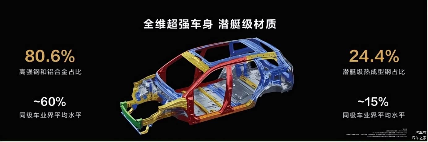 问界M7也同样重视安全性。根据官方数据,全车潜艇级热成型钢占比24.4%,每平方厘米可承受17吨重。高强钢和铝合金的占比为80.6%。