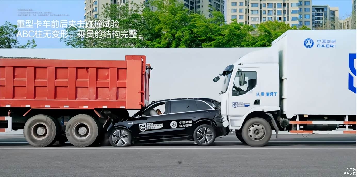 理想L6在上市时发布了中汽研的重型卡车前后夹击碰撞测试视频。结果显示,碰撞后ABC柱无变形,乘员舱结构完整。