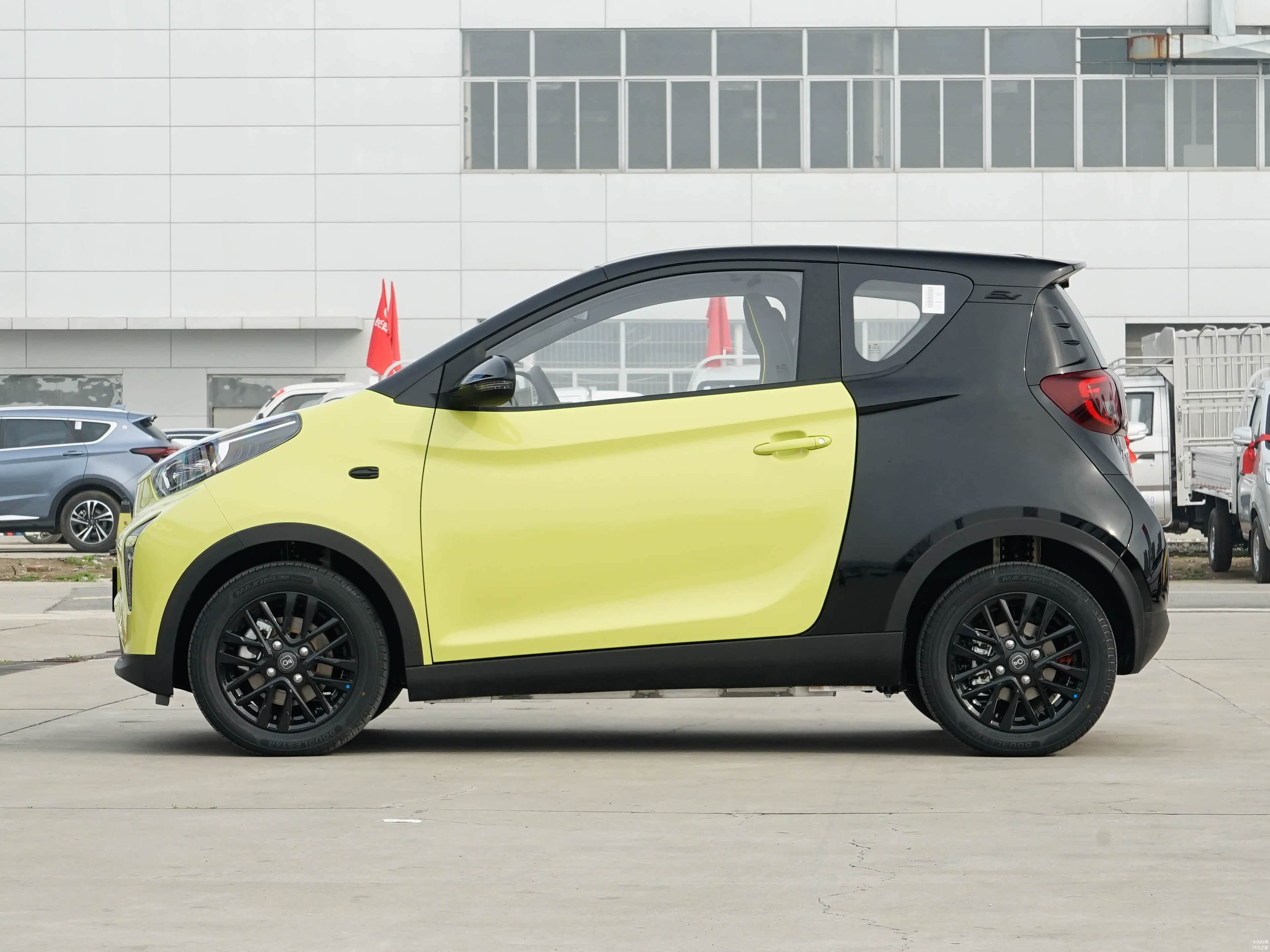 小蚂蚁的侧面采用双门设计,短小精悍的车身与四角的车轮形成稳定的平衡感。从A柱到车顶末端都采用了熏黑处理,营造出悬浮式车顶效果。车门窗后方设有三角形尾窗结构,提升了座舱内的采光度。腰线上的“√”型腰线清晰可见,与内凹的车门和相同造型的裙线相呼应,更显立体。车身裙边和轮眉覆盖有黑色组件,既实用又美观。