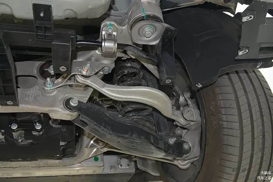 后悬采用了五连杆结构,除了粗壮的主下摆臂是双层冲压钢板之外,其余连杆包括连接盘都是铝合金材质。和智己L7的后悬结构和用料,完全一致。