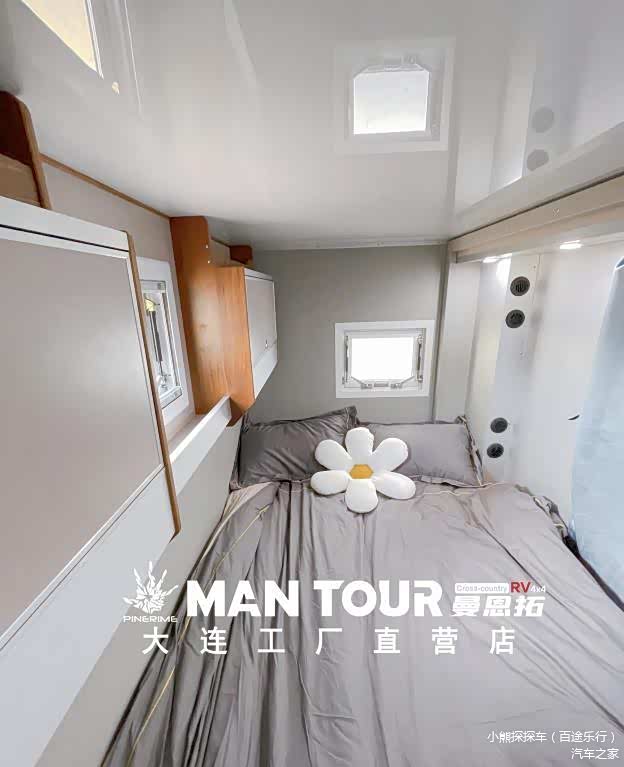 曼恩拓越野房车休息区是一个两米四乘一米四的超大双人床区域,容纳两个成年人是绰绰有余的。