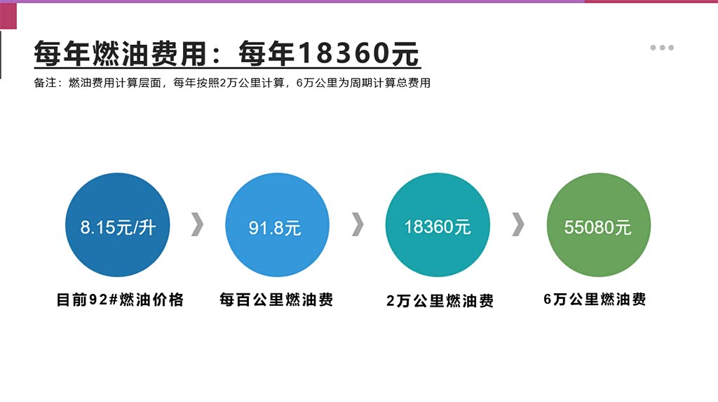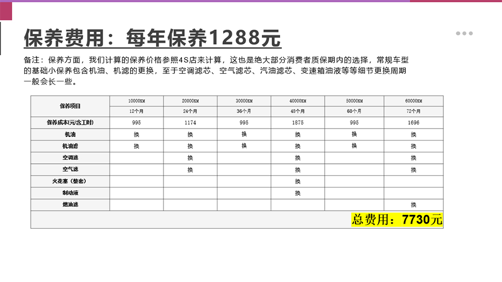 保养层面,新车基本10000公里或12个月保养一次, 6万公里/6年计算总的保养支出为7730元,按照每年1万公里来计算,平均一年保养费用为1288元,每年2万公里为2577元。