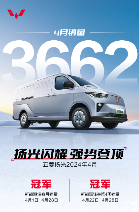 3月11日五菱扬光正式上市,售价区间7.18万-8.38万,目前在售的车型均采用封窗设计,主打物流货运。那么,五菱扬光这款新能源商用车是否得到了消费者的认可呢?根据官方公布的销量数据来看,这款车的3月销量为1742台,4月销量则为3662台。在4月,五菱扬光还取得了新能源轻客月销量第一、新能源轻客第四周销量第一,已经取得了成功。