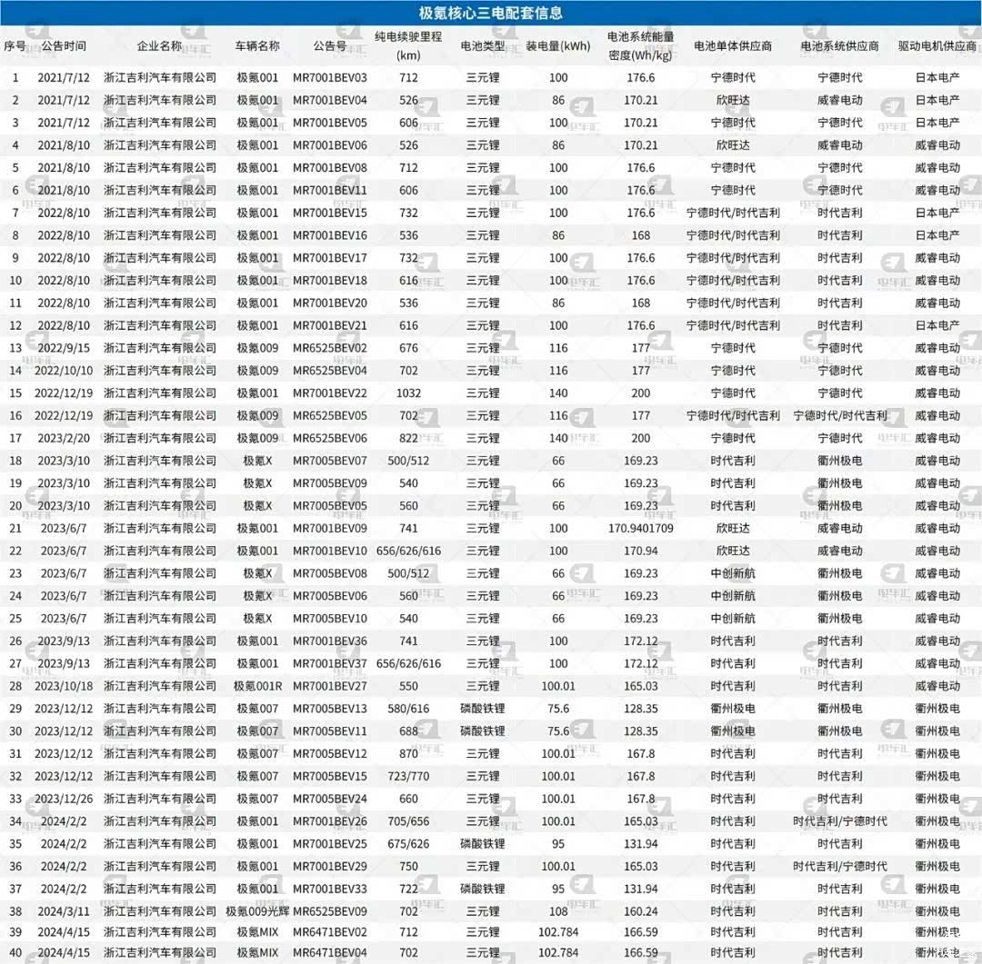 不过从2023年3月份开始,衢州极电电动汽车技术有限公司(简称:衢州极电)开始给极氪配套电池系统,威睿电动配套的车型数量逐步减少。从2023年12月份开始,衢州极电开始给极氪配套驱动电机,截止381批新车公告,极氪申报的新车驱动电机供应商均为衢州极电。