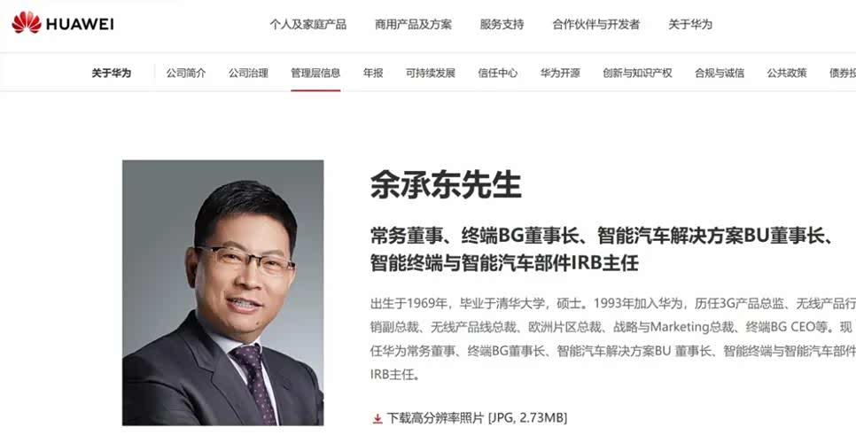 5月10日,华为官网更新管理层信息,截至目前,余承东担任华为常务董事、终端BG董事长、智能汽车解决方案BU董事长、智能终端与智能汽车部件IRB主任。
