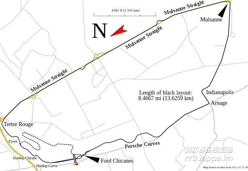 勒芒24小时耐力赛环形跑道全长13.629km(事实上,不同的年代可能会变化,但是大致是13km左右)。绝大部分都是封闭式的高速公路,跑道中有一段6km的大直道,尾速甚至会超过恐怖的400km/h。