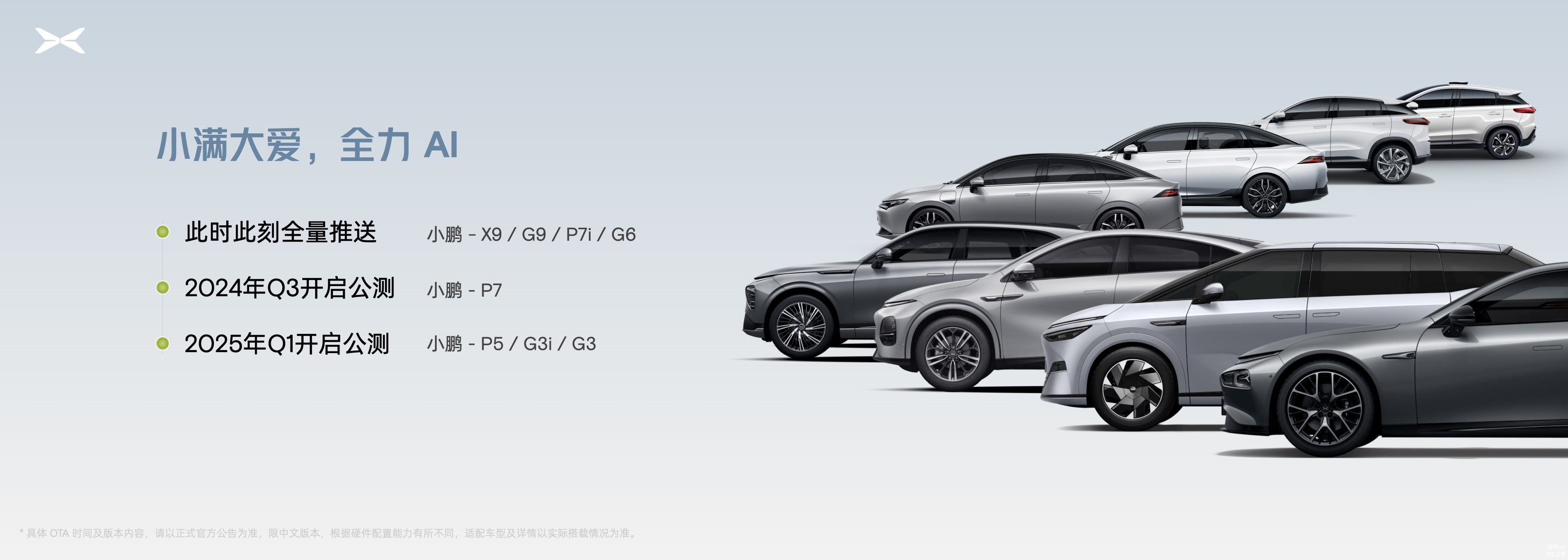 在小鹏汽车“开启AI智驾时代”发布会中,小鹏汽车官方宣布,AI天玑系统开启全量推送。新系统在智驾、泊车、语音助手等方面迎来升级。 小鹏X9(图片 | 参数 | 询价)、G6、G9、P7i四款车型将首发推送AI天玑系统。2024年三季度小鹏P7推送,2025年一季度小鹏P5、G3和G3i上推送。同时,官方还表示全新产品小鹏MONA系列首款车型将在6月正式亮相。