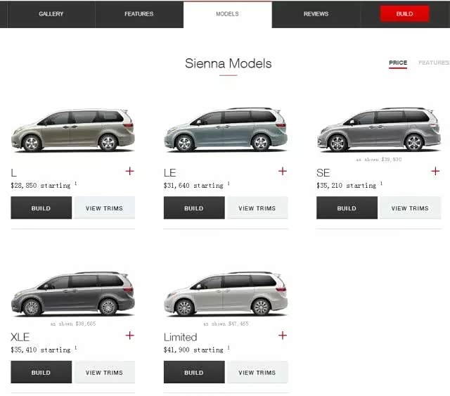 值得注意的是,如果要购买美版四驱车型,则有LE, XLE/XLE PREMIUM LIMITED/LIMITED PREMIUM可供选择,而SE版本只提供两驱车型。因此如果想要同时拥有四驱与豪华配置,那就只能从XLE版开始选了。而加版四驱则没有高配车型,也没有八座车型。所以要购买四驱塞纳的朋友,建议更多的考虑美版车型,除非你可以忍受加版的座位数和相对低的配置,或者美版LE版本没办法加装选装包的超低配置。