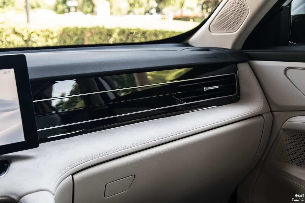车内采用了比较多元化的覆盖材质,高频触摸的地方都使用了麂皮加皮质的用料,而中岛区域以及中控台副驾驶区域采用了非常丝滑的面板覆盖。