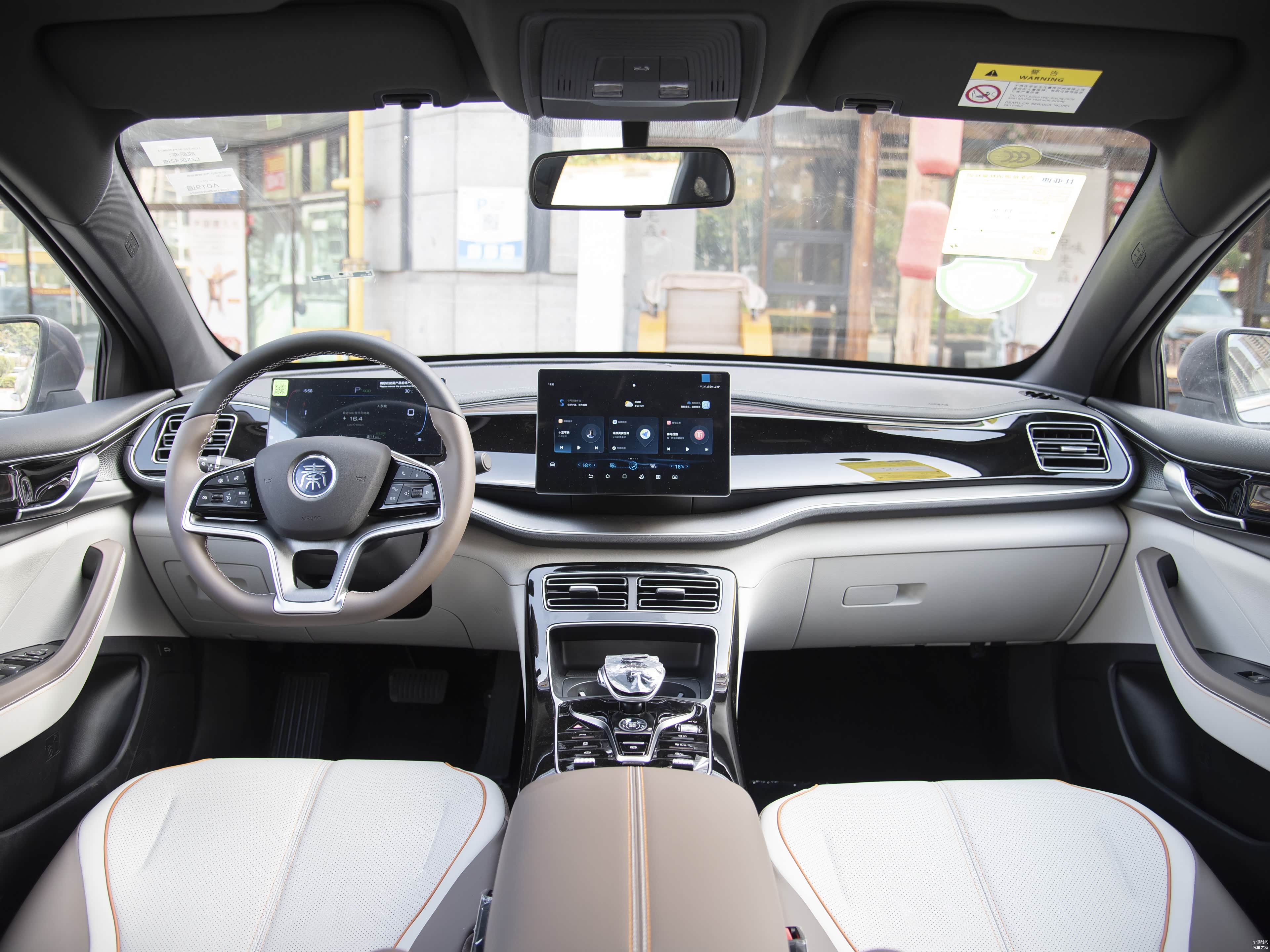 在内饰设计方面,秦PLUS DM-i的整体布局注重品质感,中控台线条分明,亮黑色面板、方块形出风口以及双色调方向盘等元素共同打造出了极佳的视觉享受。内饰的色彩搭配选用了温暖宜人的棕色和米色,搭配深色的仪表板和门板,营造出了一种温馨舒适的驾乘环境。中央位置设置有12.8英寸的高清大屏幕,同时支持旋转切换功能,从实际操作体验来看,该显示屏的清晰度和流畅度均表现优异,同时,UI界面简洁直观,支持地图、音乐、视频等主流应用,此外,车内还配备了8.8英寸的全液晶仪表。