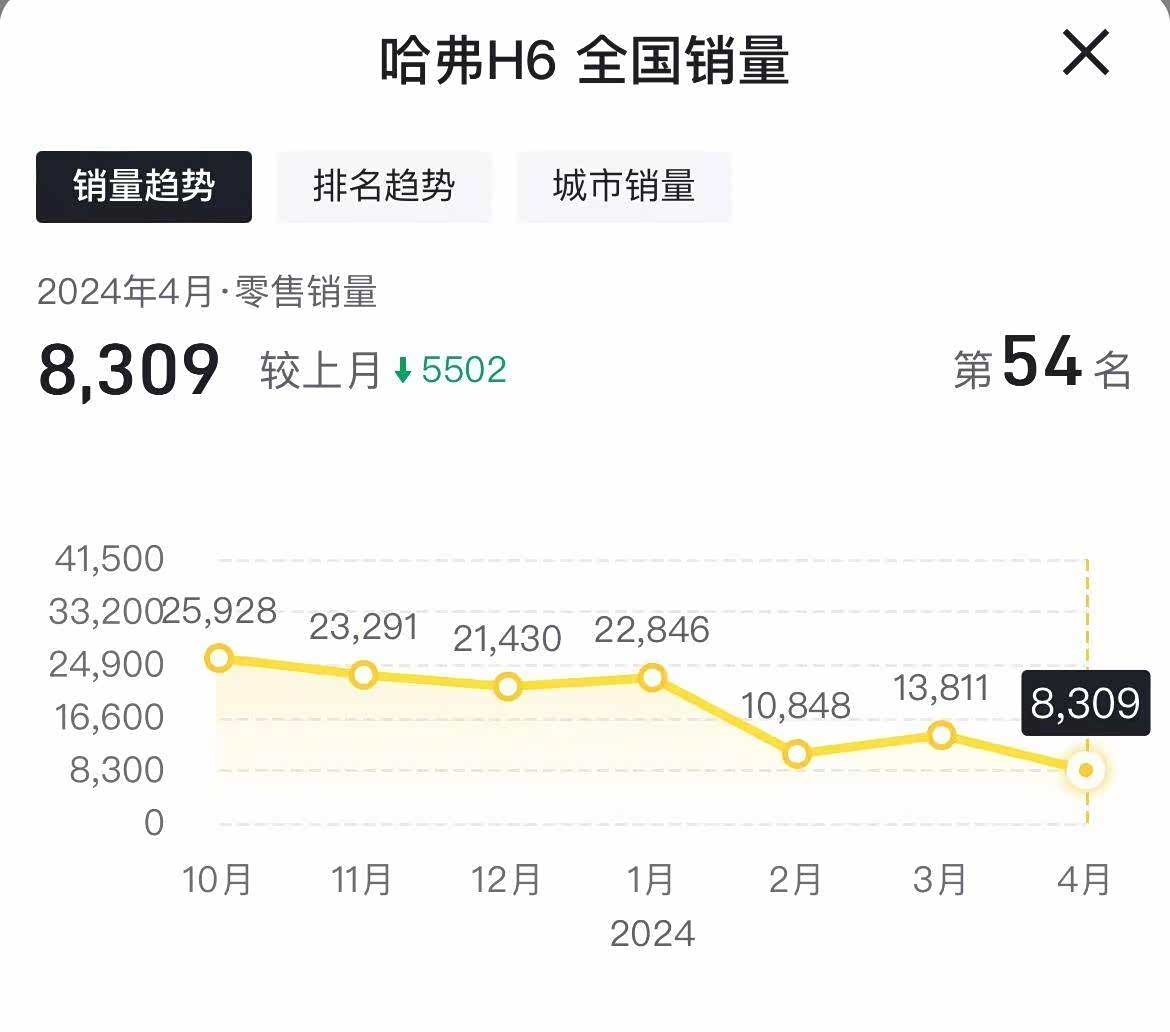 哈弗H6也是车圈国产老将了,车型服役至今有13年了,累计销量早已超400万辆。曾最高月销超8万台,也曾是国内SUV榜首。所以很多车迷都非常期待换代车型的到来,也正因为新一代 哈弗H6(图片 | 参数 | 询价)上市在即,现款车型销量有所松动,最新4月份卖出8309辆,没有过万。