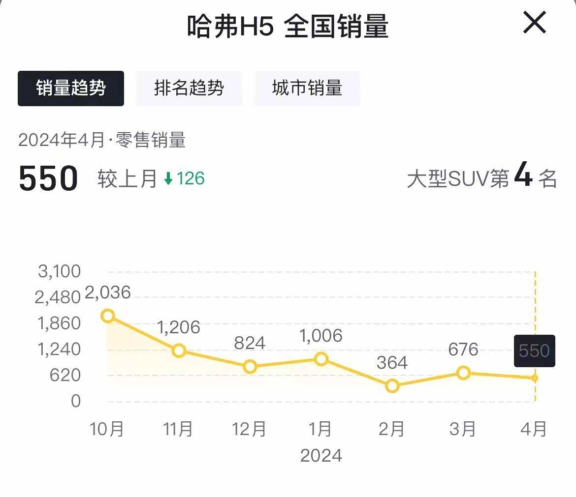 再来看一位“冷门选手”,哈弗H5,它的尺寸达到大型SUV级别,但定价却在12.28万-15.78万元区间。该级别基本以豪华/高端定位为主,所以哈弗H5在该级别并没有直接竞争对手,4月份销量为550台,近半年卖出4626台,主要强调功能性。