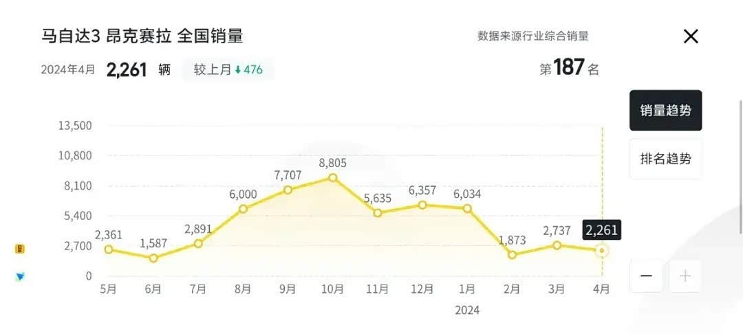 虽然马自达3 昂克赛拉的产品力不错,但销量表现一般。今年1-4月累计销量12905辆,月均销量3000多辆,