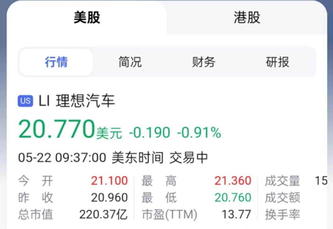 5月22日,理想汽车的股价已经跌到了20.77美元,总市值也来到了220.37亿美元,相比高峰时期的股价已经跌掉了一半还多。