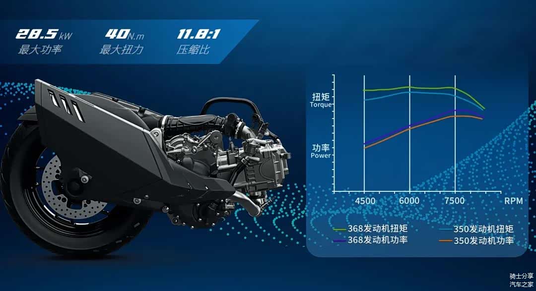 这是一款单缸水冷四气门电喷引擎,并配套有博世电喷系统。它实际排量368 cc,最大功率28.5KW,最大扭矩40N·m,官方百公里油耗3.5L。