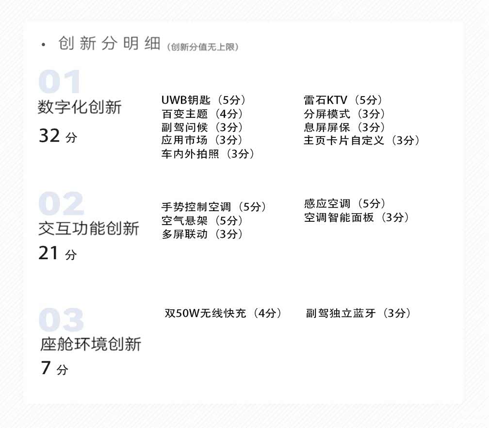 在智能座舱“光速”发展的当下,新技术、新功能、新体验层出不穷,或许它目前不包含在基础项内,但能带来惊喜感和实用性,甚至可能是座舱体验的点睛之笔,这就是为何我们会引入且高度关注创新项的原因。