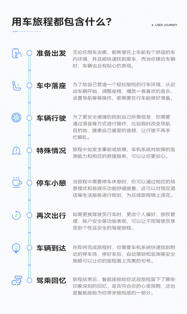 所谓旅程维度,即从出行规划的“准备出发”阶段开始,到出行旅程结束后的“驾乘回忆”阶段,将用户出行的相关用车场景,通过“旅程”由点串成的线。同时将功能体验融入到场景中,并解析其带来的用户价值。