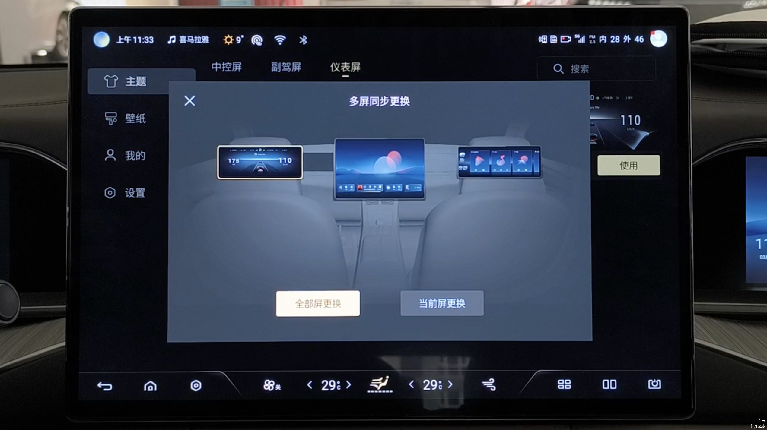 另外,用户还可以利用短暂停车的时间,更改仪表、中控和副驾屏的主题,彰显用户的个性,也让车机保持新鲜感。不过当前“百变主题”应用中,仅个别主题可同时覆盖上述三屏,不同屏幕用不同主题看上去难免有些割裂感。