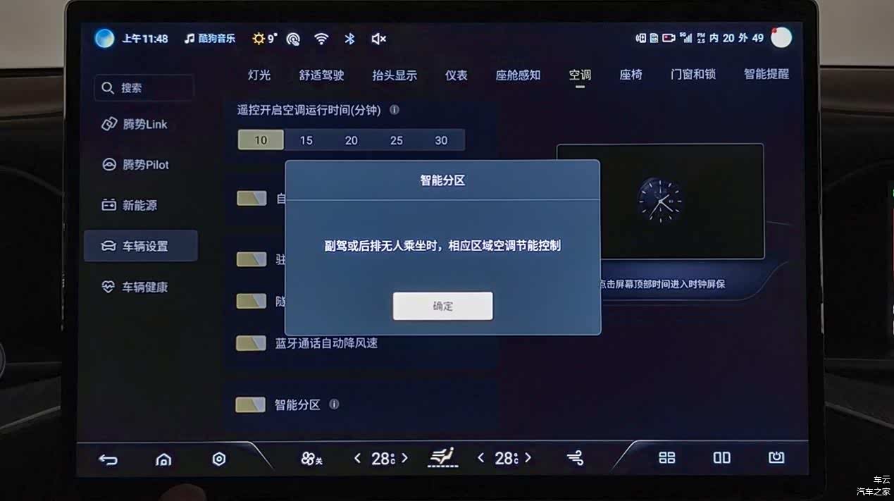 在腾势N7上这个问题有解了,开启空调智能分区后,系统会通过座椅内的传感器判断车内乘员的位置和数量,并在副驾或后排无人时,自动关闭无人温区的空调出风口,有助于降低车内电器的能耗与行车中的噪音。