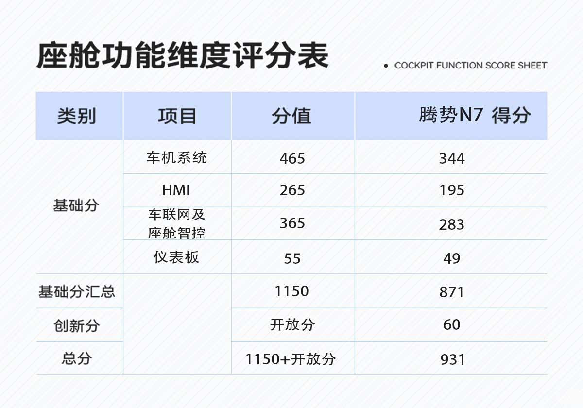 升级后的《CC-1000T智能座舱评测体系》,依旧包含基础项与创新项两部分,基础项共涉及230个评测项,每项5分制,满分为1150分。创新项作为独立评价,根据车型表现,同样每项5分制,但不设总分上限。基础项与创新项之和为该车型智能座舱表现的总分。简言之,如今的“4.0体系”,难度更胜以往,想得高分,座舱体验的“大格局”、功能体验的“小细节”以及打造座舱的创造力,三者缺一不可。