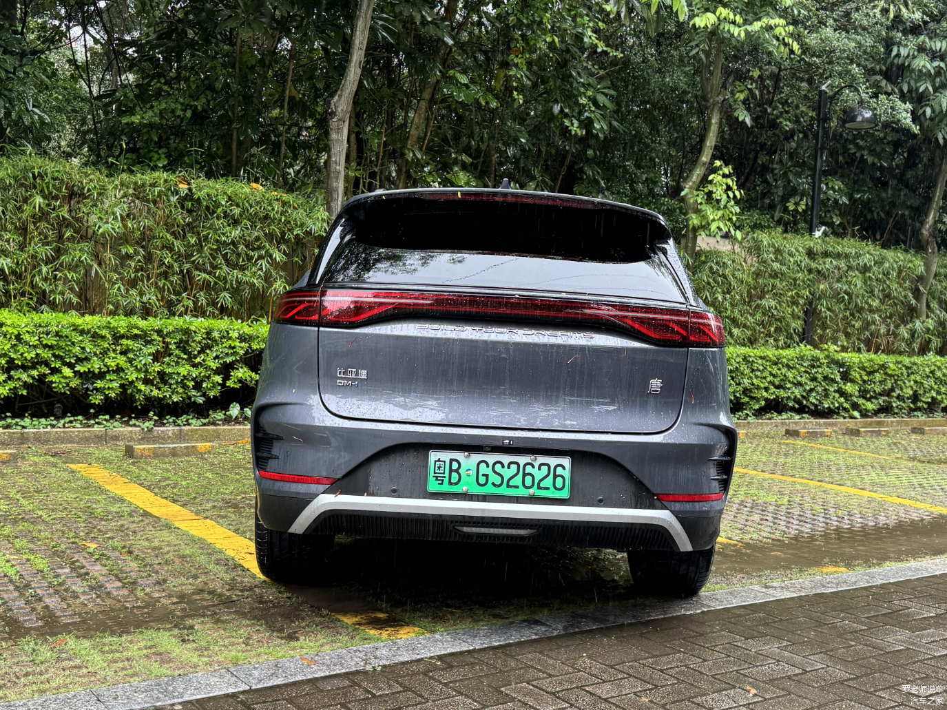 尾部方面,唐DM-i车尾采用了贯穿式尾灯设计,尾灯下方选用了品牌英文LOGO标识,后保险杠两侧配有装饰用扰流板,增加了尾部运动感。