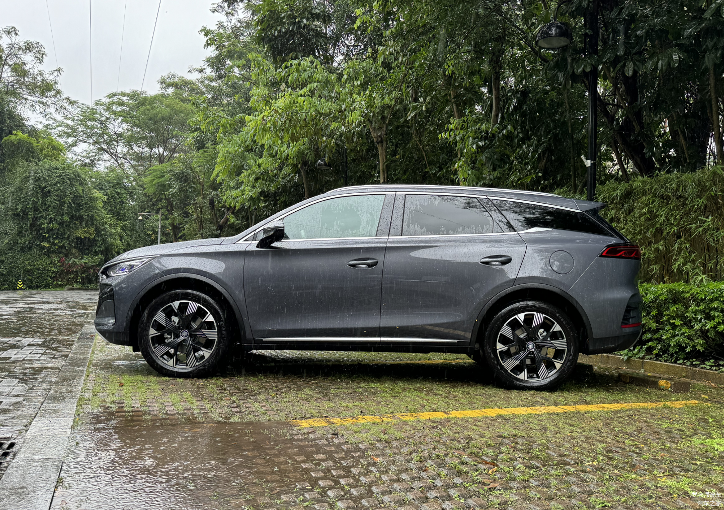 侧面来看,唐DM-i的线条较为圆润饱满,车顶采用了悬浮式的设计,看起来美感还是不错的。尺寸方面,唐DM-i的长宽高分别为4870/1950/1725mm,轴距为2820mm。