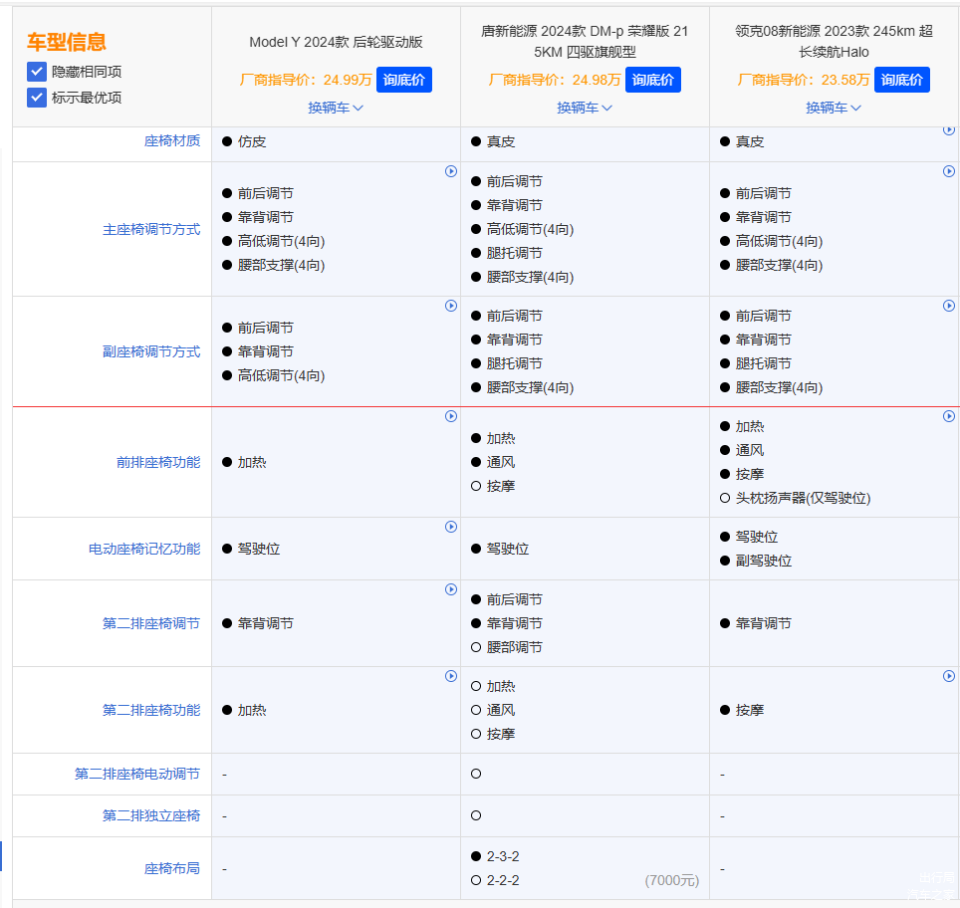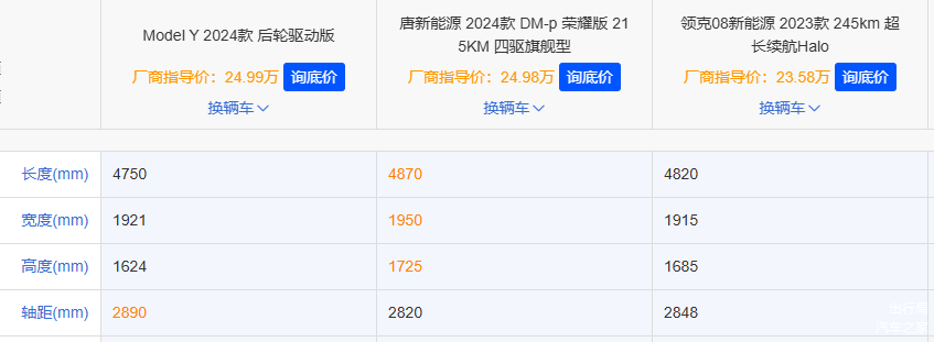 为了更直观地展示特斯拉、比亚迪、领克三家品牌的诚意输出,我们选择了价位相近的后轮驱动版Model Y(24.99万元)、四驱旗舰型唐DM-p(24.99万)和超长续航Halo领克08 EM-P(23.58万元)。